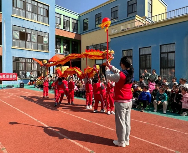 節日當天大班的小朋友特地給大家帶來了精彩的舞龍表演。瞧!在教師的帶領下,寶貝們揮動著手中的龍,奔跑跳躍,用龍之舞迎接希望,帶來勃勃生機和無限活力!