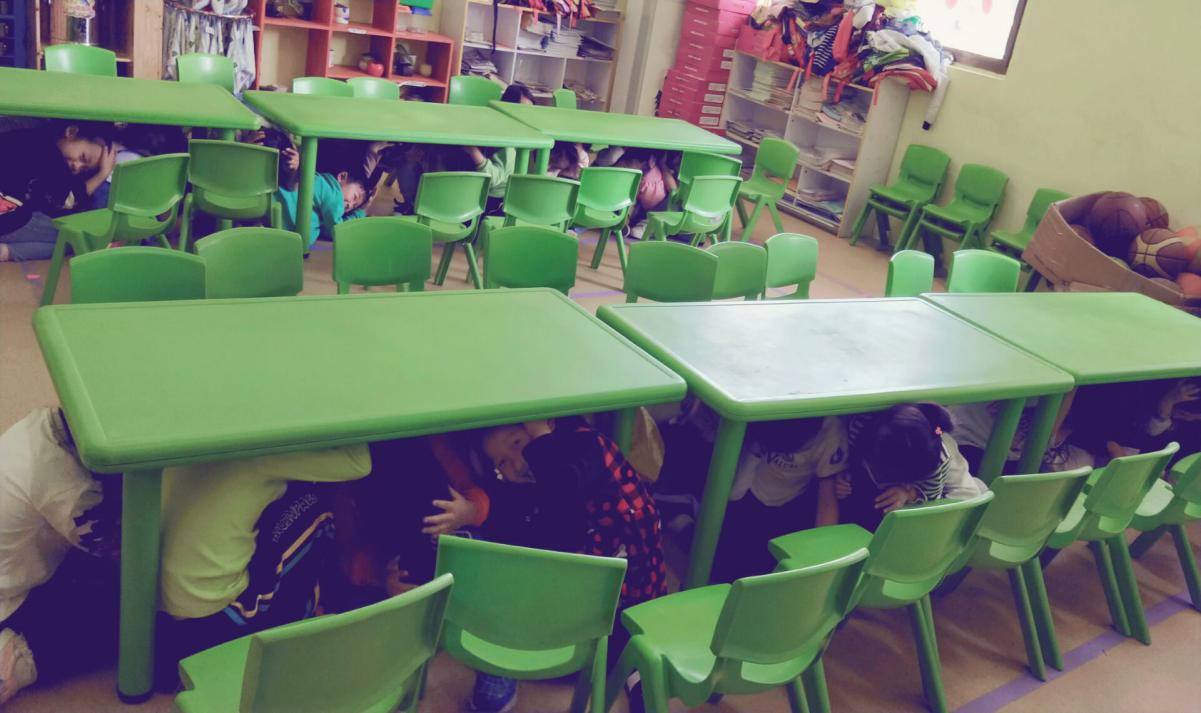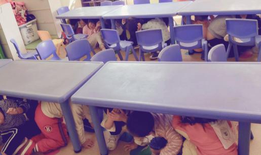 下午2點(diǎn)30分,隨著一陣急促的鈴聲,演習(xí)開(kāi)始了。孩子們?cè)诶蠋煹囊龑?dǎo)下,紛紛選擇桌子、廁所管道等地方進(jìn)行躲避,“抱頭”、“閉眼”、“蹲下”,老師們不時(shí)的提醒著孩子們。兩分鐘后,緊急鈴聲再次響起,孩子們?cè)诶蠋煹膸ьI(lǐng)下,快速有序地經(jīng)過(guò)安全出口,撤離到安全區(qū)域。