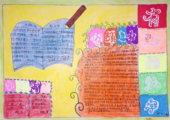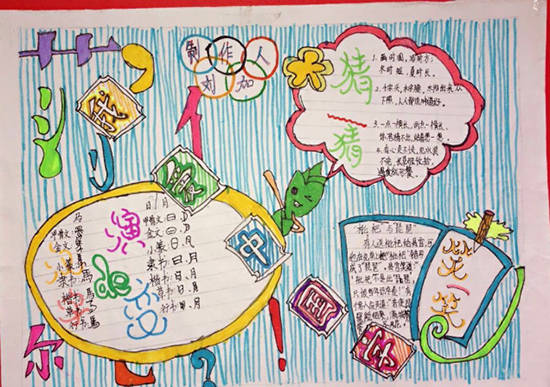 語文教材第五組《綜合性學(xué)習(xí):遨游漢字王國》是引導(dǎo)學(xué)生進(jìn)行綜合性學(xué)習(xí),初步了解漢字的特點(diǎn)和發(fā)展歷史,加深學(xué)生對漢字和中華傳統(tǒng)文化的感情,提高正確運(yùn)用漢字的自覺性。同時培養(yǎng)學(xué)生策劃和開展活動、查找和運(yùn)用資料的能力。比賽前語文老師組織學(xué)生學(xué)習(xí)了有關(guān)課文,讓學(xué)生收集“有趣的漢字”各方面的知識,并通過自己靈巧的雙手,精心設(shè)計(jì)版面,創(chuàng)作出了一幅幅色彩艷麗、構(gòu)思獨(dú)特、內(nèi)容豐富的手抄報。本次手抄報內(nèi)容涉及有趣的字謎、倉頡造字、一點(diǎn)值千金、諧音歇后語、諧音笑話、字的來歷等方面的知識,收到了很好的教育效果。