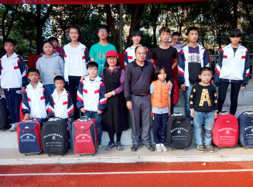 最后,劉董事長、楊校長為45名家庭貧困學生發放學生用品及慰問金,并和貧困學生合影留念。