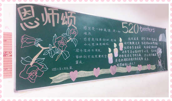 本期黑板報美觀靚麗,精彩紛呈,讓同學(xué)們通過參與,懂得了感恩的重要,懂得了怎樣去感恩別人,學(xué)會了對父母、學(xué)校、社會心懷感激之情,為校園文化增添了一道亮麗的風(fēng)景線。