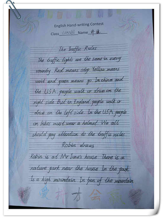英語書寫創意比賽,豐富了學生英語學習的課余生活,激發了學生對英文書寫美感的熱情,同時也培養了學生的的創新能力,為學生提供了一個展示自我的舞臺。