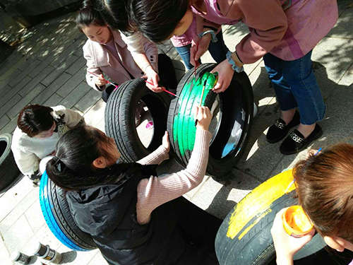輪胎作為一種低結(jié)構(gòu)廢舊材料,有無限的利用和創(chuàng)意空間,既能美化幼兒園環(huán)境,又能促進(jìn)幼兒的體、智、能發(fā)展。為了給孩子們提供更加豐富多彩的游戲材料,迪斯尼·金沙園積極收集大量不同型號(hào)的廢舊輪胎,2017年3月28日上午,楊園長帶頭組織教師們利用課余時(shí)間,大膽進(jìn)行創(chuàng)意彩繪活動(dòng),對(duì)輪胎進(jìn)行美化。