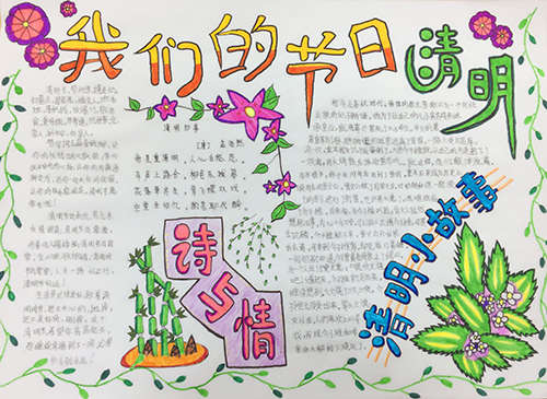 “我們的節(jié)日·清明”節(jié)日小報創(chuàng)作作品要求以清明節(jié)所蘊含的傳統(tǒng)文化內涵為主題,內容精煉、圖文并茂,色彩搭配合理、作品有創(chuàng)意、報頭新穎、貼切。小學低年級以繪畫展現(xiàn)為主;小學高年級以文字采集為主;中學生以表現(xiàn)自身感悟和創(chuàng)作技巧為主。