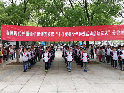 ? 為了響應南昌市教育局的號召,引導未成年人學習美德、踐行美德、弘揚美德、做一個有道德的人。鼓勵他們?yōu)殚L輩盡孝心,為他人獻愛心,為同學送關心。5月2日晨會,南昌現(xiàn)代外國語學校(迎賓校區(qū))小學部全體師生參加了南昌市第三屆“十佳美德少年”評選活動的啟動儀式。啟動儀式在莊嚴的國歌聲中拉開了帷幕。