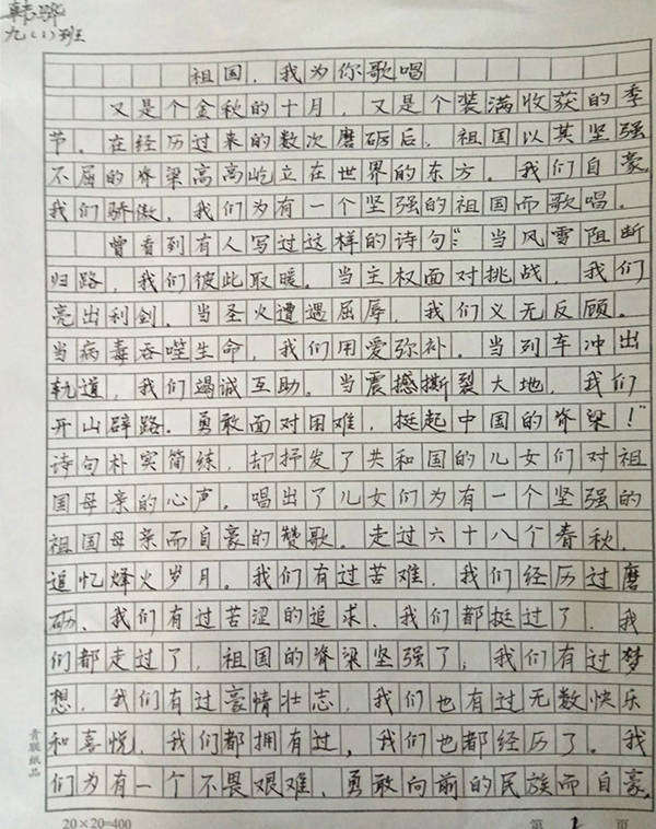 今年是偉大的祖國成立68周年,為了更好地弘揚愛國主義,也為了檢測中學生的習作能力,南昌現代外國語學校(迎賓校區)初中部組織了以“愛我中國”為主題的國慶征文比賽。
