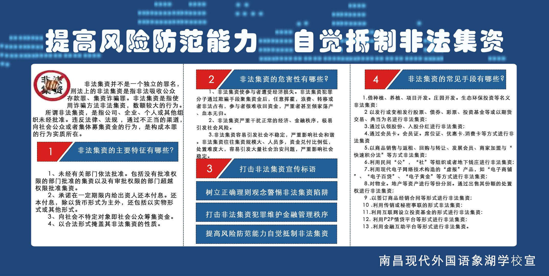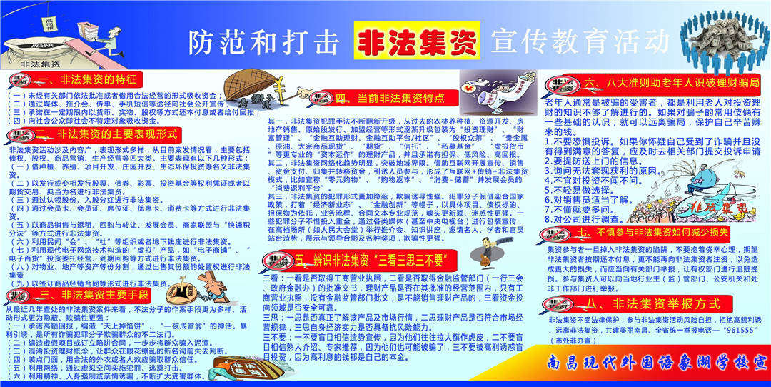 根據(jù)《南昌市2018年防范和打擊非法集資宣傳月活動(dòng)實(shí)施方案》要求,以保護(hù)人民群眾切身利益、維護(hù)社會(huì)穩(wěn)定為出發(fā)點(diǎn),提高社會(huì)公眾對(duì)非法集資的識(shí)別能力,教育人民群眾增強(qiáng)風(fēng)險(xiǎn)防范意識(shí),培養(yǎng)正確的投資理念,營(yíng)造防范打擊非法集資的良好輿論氛圍,震懾犯罪分子,并以此擴(kuò)大宣傳教育覆蓋面,增強(qiáng)宣傳效果,我校特開(kāi)展防范和打擊非法集資宣傳教育進(jìn)校園活動(dòng)。