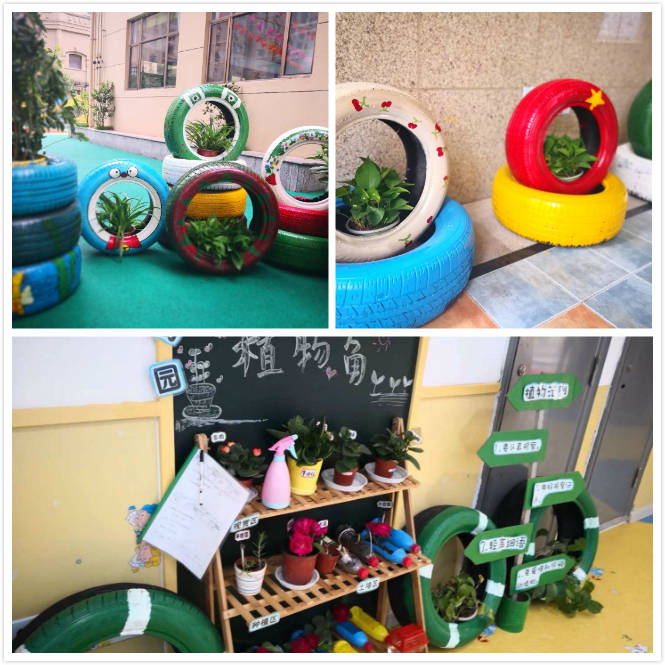 園所里準備有許多廢舊的輪胎,教師們打算為利用它們營造美好幼兒園,特意為它們穿上“漂亮的衣服”。老師們用大刷子和油漆把每個輪胎都裝扮的各有特色,有的是“叮當貓”的圖案,有的是“西瓜”的圖案。再利用植物,把幼兒園的某些角落裝扮溫馨漂亮。