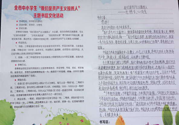 為深入貫徹團市委、市教育局、市學(xué)聯(lián)、市少工委《關(guān)于在青少年中深入開展“我們是共產(chǎn)主義接班人”主題團、隊宣傳教育活動的通知》的文件要求,進一步引導(dǎo)廣大共青團員、少先隊員樹立共產(chǎn)主義遠大理想,堅定跟黨走中國特色社會主義道路的信念和信心,增強青少年對黨和社會主義祖國的樸素感情,近日,南昌現(xiàn)代外國語學(xué)校(象湖校區(qū))積極組織全校學(xué)生開展了以“我們是共產(chǎn)主義接班人”為主題的書信文化活動。此次活動旨在通過專用郵資信封和信箋作為載體,以傳統(tǒng)書信傳遞真情的形式,深化團員和少先隊員對實現(xiàn)遠大理想要靠廣大青年腳踏實地奮斗的認識理解,讓青少年認識到共產(chǎn)主義理想的實現(xiàn)需要一代又一代人的接力奮斗,鼓勵學(xué)生們不僅僅要做一名好學(xué)生,更要成為一個有所擔當?shù)墓伯a(chǎn)主義接班人。